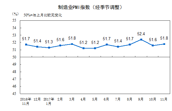 人民網(wǎng)北京11月30日電 據(jù)國家統(tǒng)計局網(wǎng)站消息,2017年11月份,中國制造業(yè)采購經(jīng)理指數(shù)(PMI)為51.8%,比上月上升0.2個百分點,制造業(yè)繼續(xù)保持穩(wěn)中有升的發(fā)展態(tài)勢。
