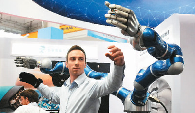 | 8月24日,北京亦創(chuàng)國際會(huì)展中心機(jī)器人大會(huì)上,一位德國的技術(shù)人員在展示機(jī)器人。 |