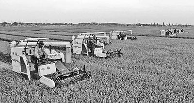 江蘇省興化市國家糧食生產功能區(qū)智慧農業(yè)服務中心糧食產業(yè)園收割水稻的繁忙景象。湯德宏攝/光明圖片