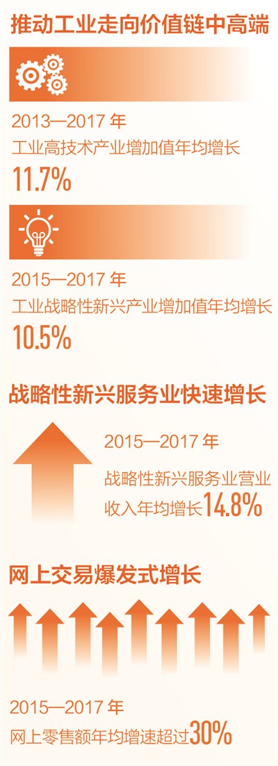 戰(zhàn)略性新興服務(wù)業(yè)快速增長,服務(wù)質(zhì)量和水平不斷提升。2015—2017年,戰(zhàn)略性新興服務(wù)業(yè)營業(yè)收入年均增長14.8%,高于同期規(guī)模以上服務(wù)業(yè)營業(yè)收入年均增速3.5個(gè)百分點(diǎn)。網(wǎng)上交易爆發(fā)式增長,激發(fā)了國內(nèi)市場活力和消費(fèi)需求。2015—2017年,網(wǎng)上零售額年均增速超過30%,高于社會(huì)消費(fèi)品零售總額年均增速約20個(gè)百分點(diǎn)。