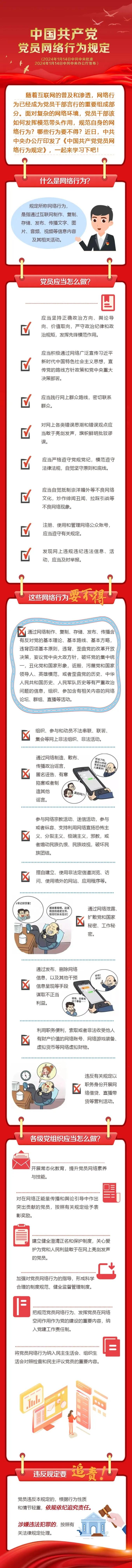 《中國共產(chǎn)黨黨員網(wǎng)絡(luò)行為規(guī)定》于2024年1月14日經(jīng)黨中央批準(zhǔn)、辦公廳發(fā)布后同日施行,它是第一部規(guī)范黨員網(wǎng)絡(luò)行為的黨內(nèi)法規(guī),是全體黨員使用網(wǎng)絡(luò)的根本遵循,共計5章31條。