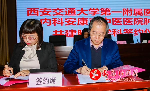 本網(wǎng)訊 (通訊員 嚴(yán)麗 奚穎)11月1日上午,2019腫瘤新進(jìn)展專家論壇暨西安交通大學(xué)第一附屬醫(yī)院腫瘤內(nèi)科與安康市中醫(yī)醫(yī)院腫瘤科共建學(xué)科揭牌儀式在安康舉行。安康市保健辦主任陳少甫出席揭牌儀式并致辭。西交大一附院腫瘤內(nèi)科李恩孝主任、楊謹(jǐn)主任、姚煜主任等專家教授,安康市中醫(yī)醫(yī)院李東波副院長、腫瘤科主任嚴(yán)麗及團(tuán)隊(duì)參加儀式。李恩孝代表一附院腫瘤內(nèi)科與市中醫(yī)醫(yī)院腫瘤科嚴(yán)麗簽署了共建腫瘤學(xué)科協(xié)議,并為兩院共建學(xué)科揭牌。