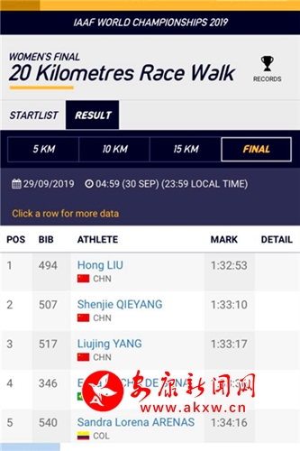 本報訊(記者 魏濤 通訊員 章理)9月30日,在2019年多哈田徑世錦賽女子20公里競走決賽中,中國隊包攬前三名,F(xiàn)世界紀(jì)錄保持者劉虹以1小時32分53秒獲得冠軍;名將切陽什姐獲得亞軍,安康籍運(yùn)動員楊柳靜以1小時33分17秒獲得季軍,這是中國田徑隊歷史上第一次在世錦賽單項目上包攬前三。