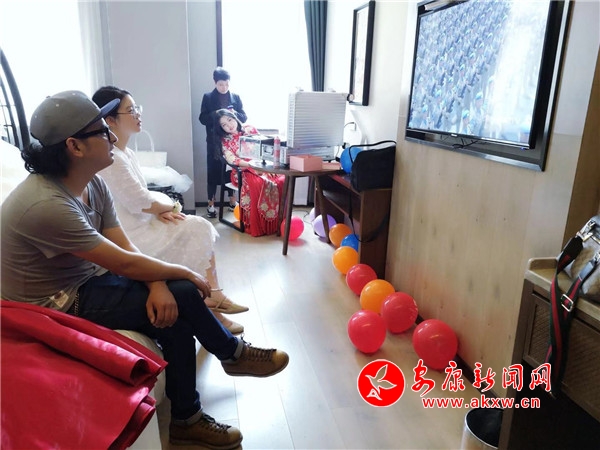 10月1日早上,一位正在裝扮的新娘忍不住偷看慶祝中華人民共和國70周年的實況轉(zhuǎn)播。(攝影 張思蕊)