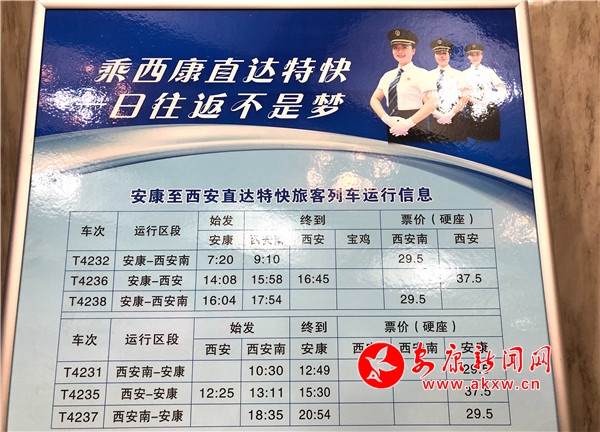 此次新增開(kāi)的直達(dá)特快,從2020年1月10日起,安康至西安南每日開(kāi)行3對(duì),早上、中午、下午各1對(duì),具體時(shí)刻為:T4232次安康早上7:20開(kāi)、西安南9:10到;T4236次安康中午14:08開(kāi)、西安南15:58到、西安16:45到;T4238次安康下午16:04開(kāi)、西安南17:54到。在票價(jià)方面,本次直達(dá)特快安康至西安南間硬座票價(jià)29.50元,安康至西安間硬座票價(jià)37.50元。3對(duì)直達(dá)特快提供硬座、軟臥、硬臥不同席位,以滿足不同旅客出行需求。