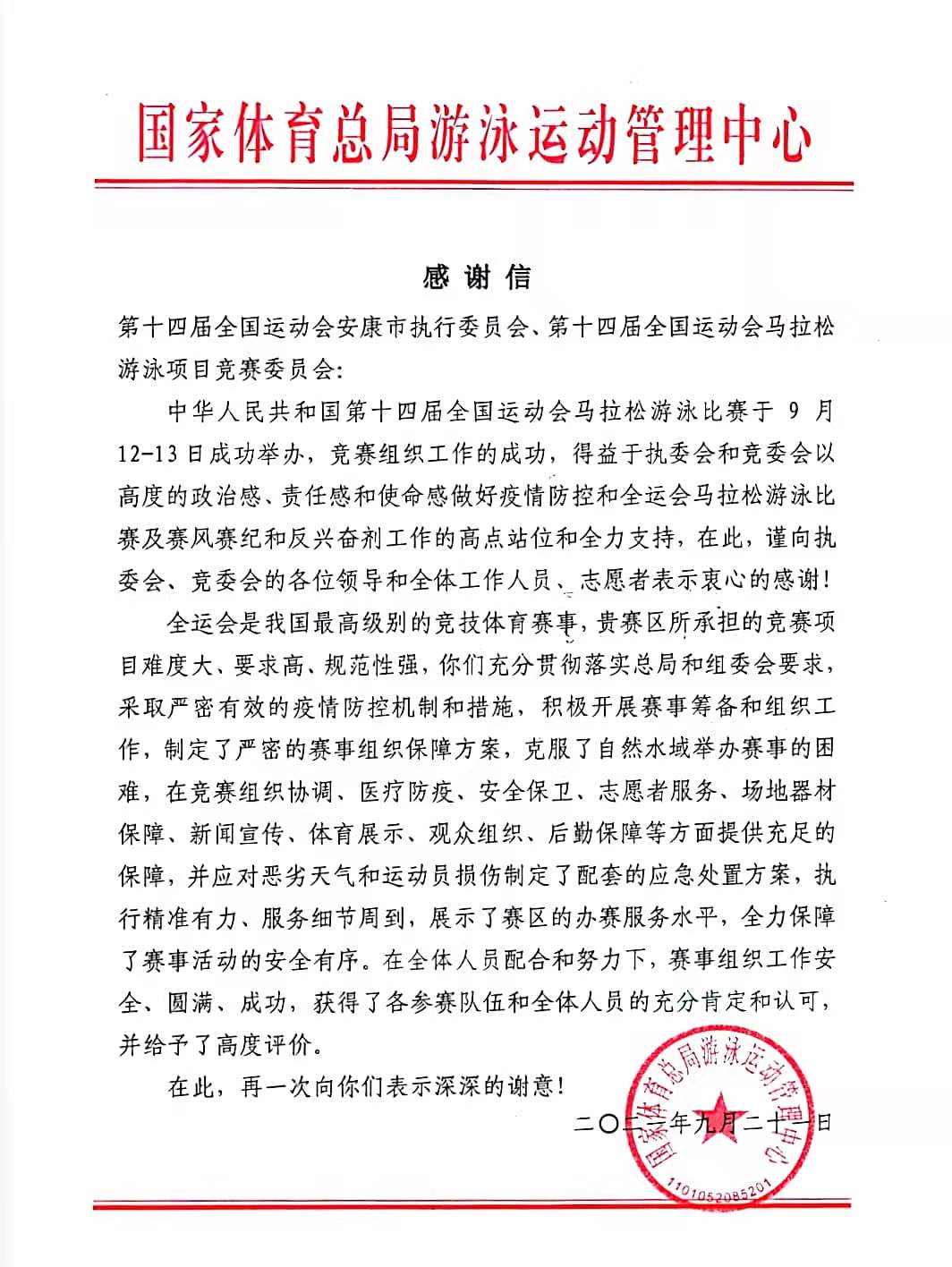 9月12日至13日,十四運會馬拉松游泳比賽在我市成功舉辦,賽事精彩、圓滿,得到了各方好評。國家體育總局游泳運動管理中心在向“第十四屆全國運動會安康市執(zhí)行委員會、第十四屆全國運動會馬拉松游泳項目競賽委員會”發(fā)來的這封感謝信中說,“競賽組織工作的成功,得益于執(zhí)委會和競委會以高度的政治感、責(zé)任感和使命感,做好疫情防控和全運會馬拉松游泳比賽及賽風(fēng)賽紀和反興奮劑工作的高點站位與全力支持,在此,謹向執(zhí)委會、競委會的各位領(lǐng)導(dǎo)和全體工作人員、志愿者表示衷心的感謝!”