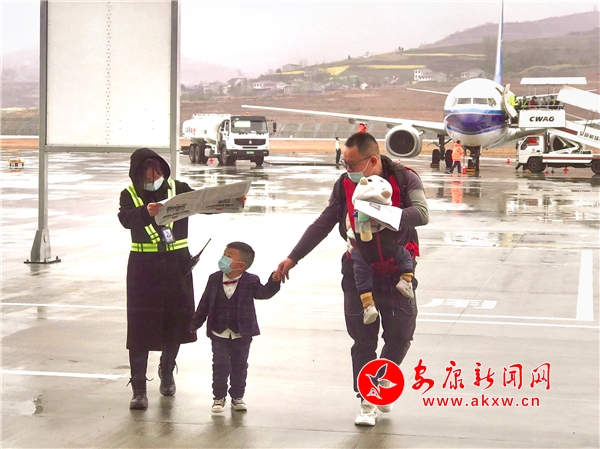 圖為安康機(jī)場工作人員在機(jī)坪為旅客服務(wù)