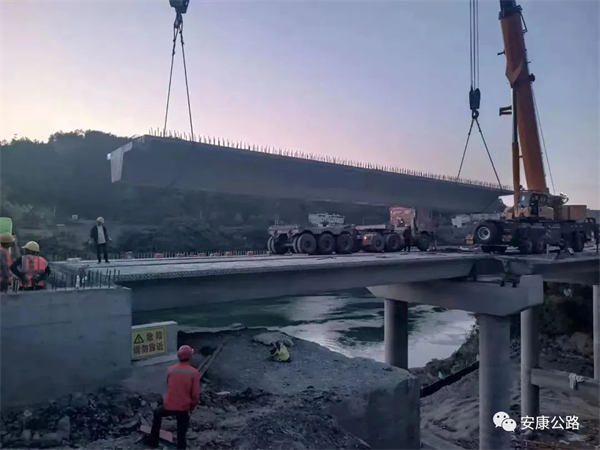 5月2日晚八點(diǎn),隨著最后一片20米預(yù)應(yīng)力箱梁穩(wěn)穩(wěn)落在橋梁支座上,安嵐高速吉河連接線改建工程老爪溝大橋順利合龍。