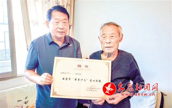 安康市書香少兒讀書會負(fù)責(zé)人李煥龍為鄺民三送上“愛心大使”聘書。