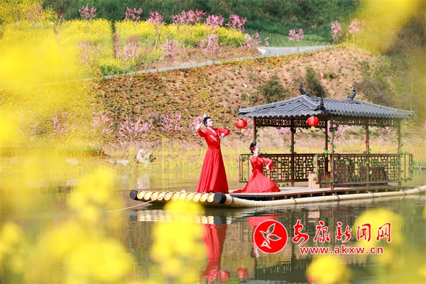 春日的水田溝村生機勃發(fā),漫山的油菜花在暖陽下爭相怒放,山坡下是一汪清澈的湖水;顒右郎骄蛣、水陸并用,將演員、舞臺、道具與水田溝村地形地貌完美融合,營造出“人在畫中游,畫在景中走”的和美景象。隨著原創(chuàng)歌曲《水田溝的油菜花》悠揚動聽的歌聲從湖面的小船傳來,活動正式拉開帷幕,獨唱《問春》、情景詩朗誦《母親河》、歌伴舞《醉美桃花源》、情景劇《桃花源記》、漢劇歌舞《喬木花》、原創(chuàng)歌曲《阿依娜》、歌伴舞《幸福安康》等精彩節(jié)目相繼上演,悠揚的歌聲、曼妙的舞姿在湖上、在油菜花田、在蜿蜒的山路漸次呈現(xiàn),將現(xiàn)場觀眾和游客迅速帶入安康桃花源美麗夢幻的油菜花海世界,沉浸式感受安康高新區(qū)產(chǎn)城綠融合發(fā)展和鄉(xiāng)村振興的顯著成效。