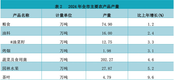 2024年,全市農(nóng)林牧漁業(yè)增加值增長3.2%。其中,農(nóng)業(yè)增加值增長4.5%;林業(yè)增加值增長7.6%;牧業(yè)增加值下降2.3%;漁業(yè)增加值增長7.0%;農(nóng)、林、牧、漁專業(yè)及輔助性活動增加值增長5.6%。