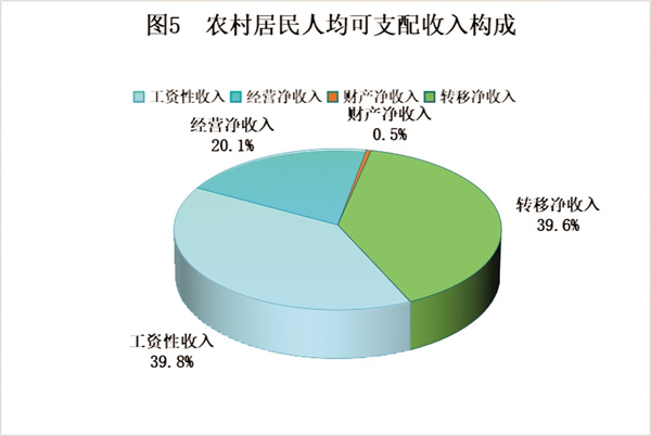 全市農(nóng)村居民人均可支配收入15434元,比上年增加1031元,增長7.2%。其中,工資性收入6149元,增長7.1%,占可支配收入的比重為39.8%;經(jīng)營凈收入3104元,增長6.0%,占比20.1%;財產(chǎn)凈收入77元,增長12.5%,占比0.5%;轉(zhuǎn)移凈收入6104元,增長7.8%,占比39.6%。