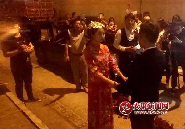 在司儀主持下,新郎從婚車上將新娘接下。兩人在四五十位親朋以及受邀作為嘉賓的過往司機祝福和掌聲中,緊緊地擁抱在一起。12時10分,經(jīng)過緊張疏通,救援人員清理出一個車道單邊放行,這對新人成功趕到位于安康市高新區(qū)的酒店成功舉辦了婚禮。