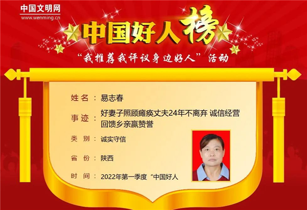 2022年第一季度“中國(guó)好人榜”發(fā)布儀式暨全國(guó)道德模范與身邊好人現(xiàn)場(chǎng)交流活動(dòng),于5月30日下午3點(diǎn),以“云”發(fā)布方式舉行,安康市易志春榮登“誠(chéng)實(shí)守信好人榜”。