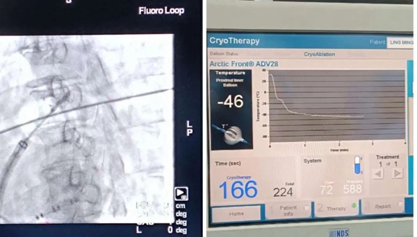 經(jīng)過詳細(xì)術(shù)前準(zhǔn)備工作后,通過穿刺股靜脈,將導(dǎo)管沿靜脈進(jìn)入右心房,經(jīng)房間隔穿刺后,將球囊分別放置在四個(gè)左心房-肺靜脈連接處,充盈球囊,使球囊完全封堵靶肺靜脈的血液回流,利用球囊尾端連接的制冷系統(tǒng),將球囊溫度迅速降低至40℃以下,使局部組織壞死,達(dá)到電隔離肺靜脈的目的。術(shù)中驗(yàn)證四個(gè)肺靜脈電位均消失,房顫不能被誘發(fā),手術(shù)成功。