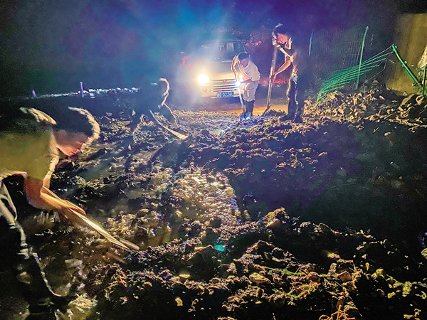 ⇑ 9月20日,嵐皋縣民主鎮(zhèn)農(nóng)田社區(qū)山洪沖上路面,鎮(zhèn)黨委、政府和社區(qū)黨支部立刻組織網(wǎng)格員、應(yīng)急搶險隊到一線抗洪搶險。陳城 攝t79安康新聞網(wǎng)
