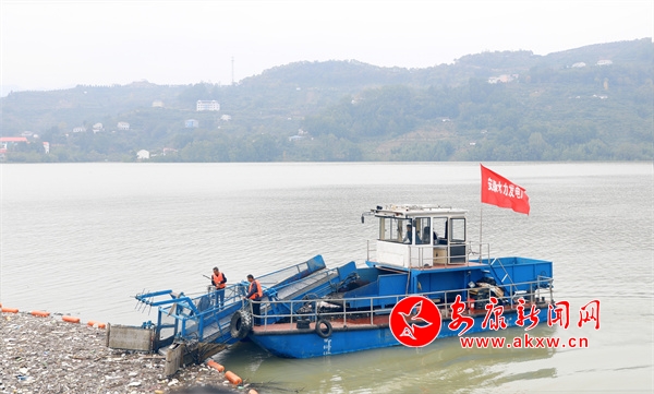 10月15日,筆者跟隨打撈隊來到瀛湖鳥島,大量的漂浮物被圍攔在河灣附近,與主河道形成鮮明對比。打撈隊負(fù)責(zé)人袁曉林介紹:“因秋淋天氣,9月中下旬起,安康經(jīng)歷十幾天的連陰雨,水位上漲,岸邊被淹沒的樹木、雜草就會在水面漂浮,影響水質(zhì)和景觀。我們在景區(qū)鳥島、清泉村、湖心街、南溪、流水等地分段集中打撈,提高效率,不影響旅游和通航。”