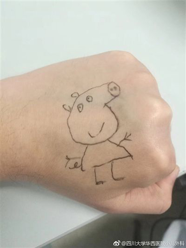 “小豬佩奇身上紋,值班用來哄病人!4月7日,四川大學華西醫(yī)院小兒外科主治醫(yī)師楊磊為了讓患者小朋友們心情愉悅,主動在左手上畫了一只流行卡通人物小豬佩奇來“討歡心”。因為遵守無菌原則,小豬佩奇很快就被洗掉,但這一幕還是被網(wǎng)友點贊,認為“有愛且專業(yè),感控愛心都需要。”