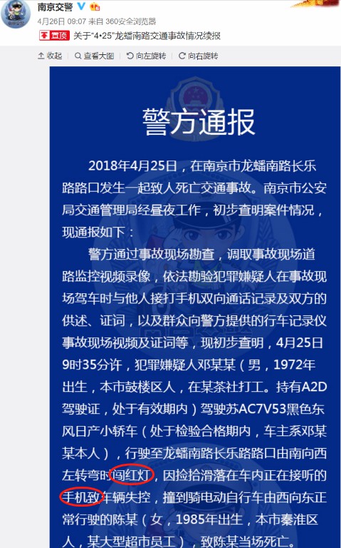 2018年4月25日,在江蘇省南京市發(fā)生一起致人死亡交通事故。經(jīng)警方調(diào)查,犯罪嫌疑人鄧某某駕駛某小轎車行駛至龍蟠南路長樂路路口由南向西左轉(zhuǎn)彎時闖紅燈,因撿拾滑落在車內(nèi)正在接聽的手機致車輛失控,撞到騎電動自行車由西向東正常行駛的陳某,致陳某當場死亡。