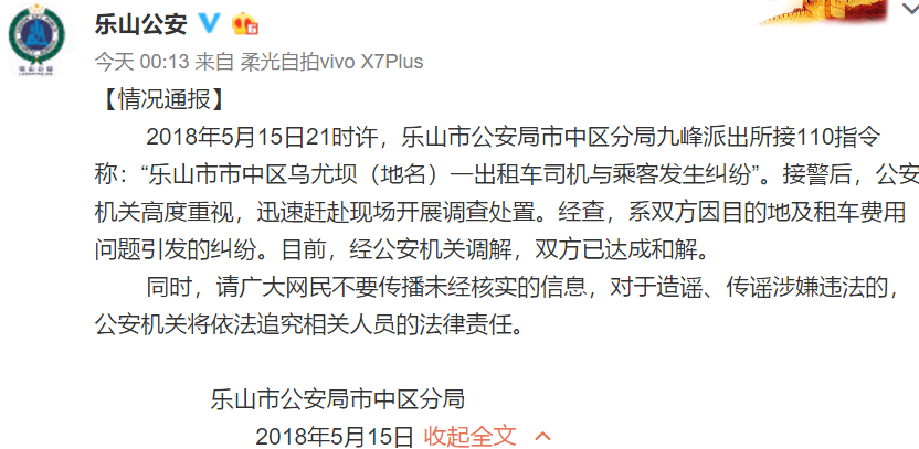 5月16日凌晨,樂山警方通報稱,2018年5月15日21時許,樂山市公安局市中區(qū)分局九峰派出所接110指令稱:“樂山市市中區(qū)烏尤壩(地名)一出租車司機與乘客發(fā)生糾紛”。接警后,當(dāng)?shù)毓矙C關(guān)高度重視,迅速趕赴現(xiàn)場開展調(diào)查處置。