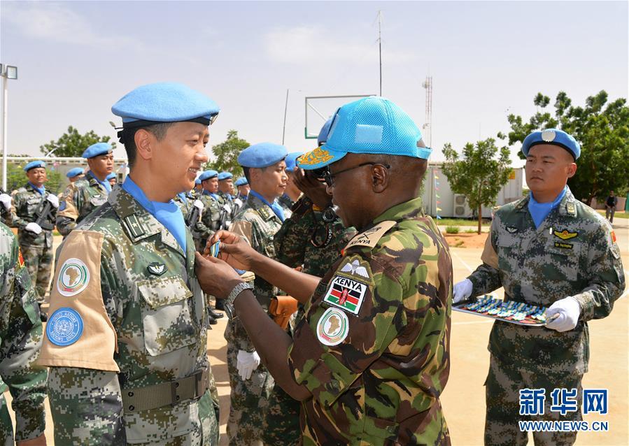 7月15日,在蘇丹達爾富爾法希爾,聯(lián)合國和非洲聯(lián)盟駐達爾富爾聯(lián)合特派團(聯(lián)非達團)部隊司令恩貢迪中將(右二)把勛章佩戴在中國維和官兵胸前。中國首支維和直升機分隊授勛儀式15日在位于蘇丹達爾富爾法希爾的營區(qū)舉行,全體140名維和官兵榮獲聯(lián)合國“和平榮譽勛章”。新華社發(fā)HWQ安康新聞網(wǎng)