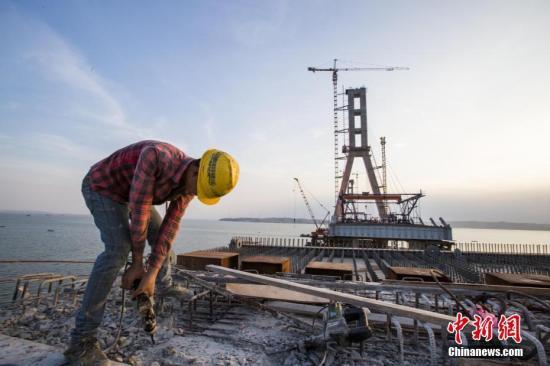 一名工人在鄱陽(yáng)湖二橋施工平臺(tái)上冒著高溫進(jìn)行施工。資料圖 傅建斌 攝