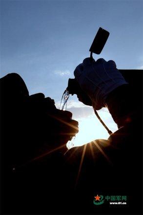 14:00,一名戰(zhàn)士正在飲水。當(dāng)天中午,部分乘員早早就開始加班強(qiáng)化訓(xùn)練。