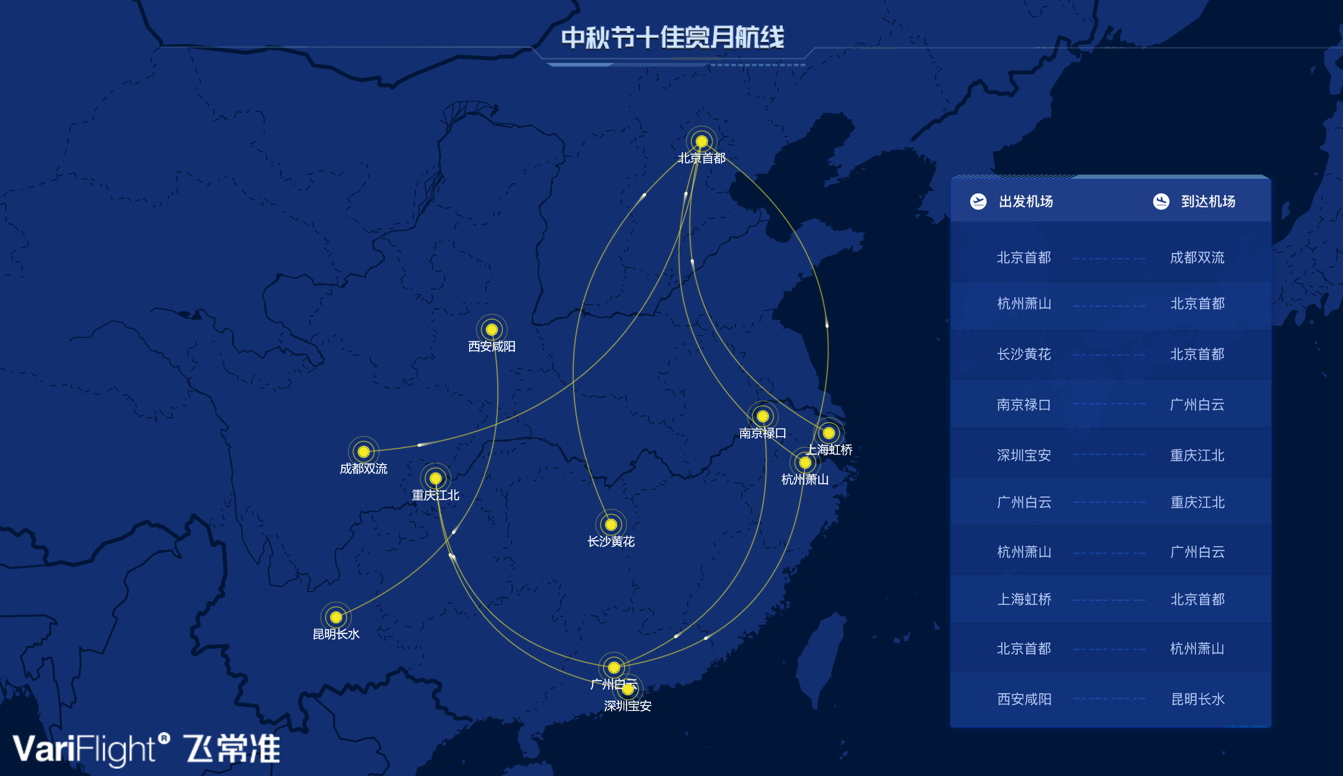 飛常準(zhǔn)大數(shù)據(jù)顯示,今年中秋節(jié)十佳賞月航線分別是北京首都-成都雙流、杭州蕭山-北京首都、長沙黃花-北京首都、南京祿口-廣州白云、深圳寶安-重慶江北、廣州白云-重慶江北、杭州蕭山-廣州白云、上海虹橋-北京首都、北京首都-杭州蕭山、西安咸陽-昆明長水。