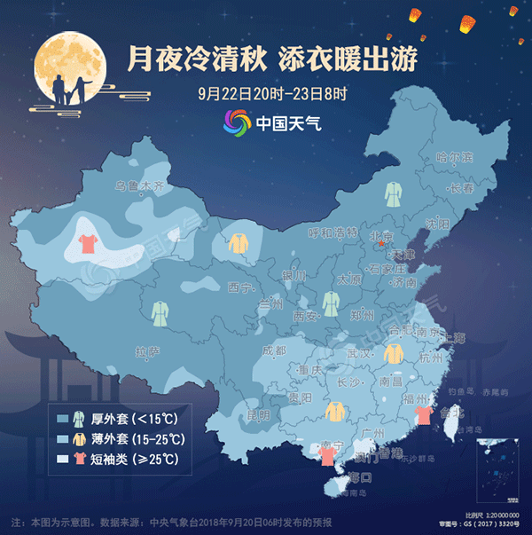 預計中秋夜,北方大部氣溫將不足15℃,體感較涼,宜穿厚點的外套;南方大部氣溫處于15-20℃之間,外出可著長袖薄款衣服;只有華南沿海局地"暑氣"未盡,氣溫處于25℃以上,著短袖類衣服即可。