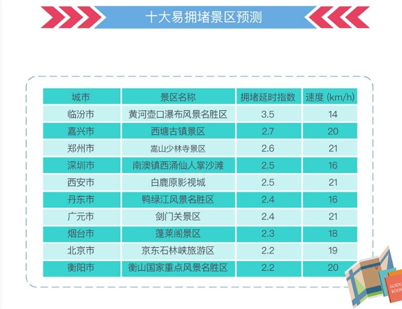 報(bào)告顯示,十一期間周邊道路易擁堵景區(qū)排名前十中,黃河壺口瀑布風(fēng)景區(qū)周邊道路擁堵延時(shí)指數(shù)達(dá)3.5,平均車速僅為每小時(shí)14公里,成為國慶出行周邊道路最為擁堵的景區(qū)。西塘古鎮(zhèn)擁堵延時(shí)指數(shù)為2.7,排名第二,平均車速為每小時(shí)20公里;排在第三名的是嵩山少林寺景區(qū)以擁堵延時(shí)指數(shù)2.6,平均車速每小時(shí)21公里。