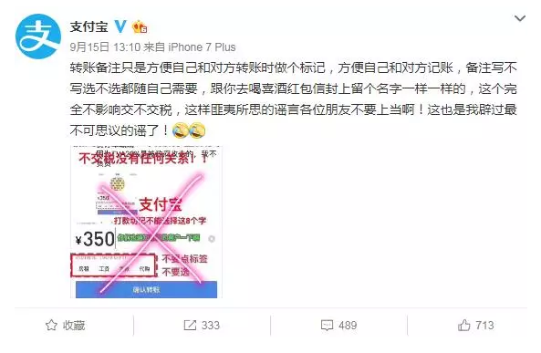 9月15日,“@支付寶”官方微博對此辟謠稱:轉(zhuǎn)賬備注只是方便自己和對方轉(zhuǎn)賬時做個標記,方便自己和對方記賬,備注寫不寫選不選都隨自己需要,跟你去喝喜酒紅包信封上留個名字一樣一樣的,這個完全不影響交不交稅。