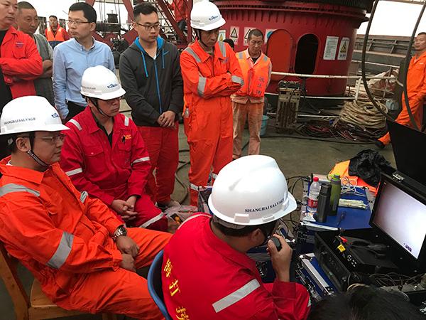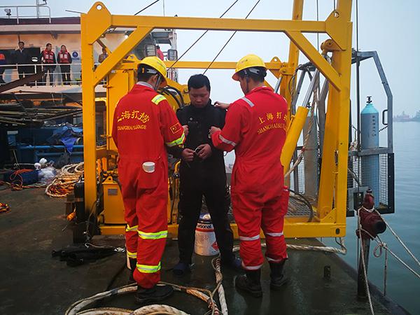 6時50分,設(shè)備調(diào)試完成后,交通運(yùn)輸部上海打撈局兩名專業(yè)潛水員第一次下水摸探。