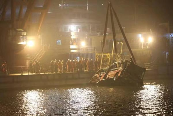 21時31分,開始對重慶萬州墜江公交車進(jìn)行起吊工作。23時45分,成功將墜江公交車整體打撈出水。
