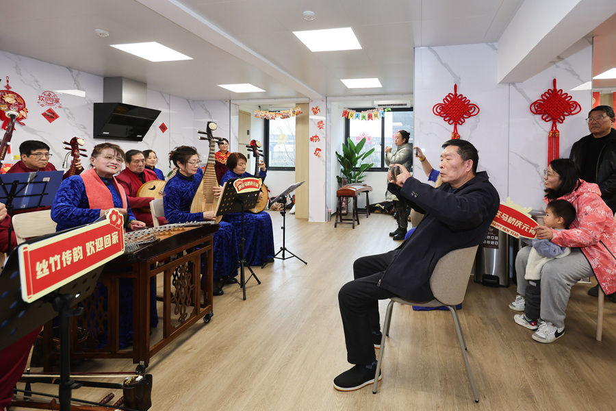 民樂隊(duì)在上海市閔行區(qū)新時代城市建設(shè)者管理者之家演奏(2024年2月23日攝)。新華社記者王翔 攝