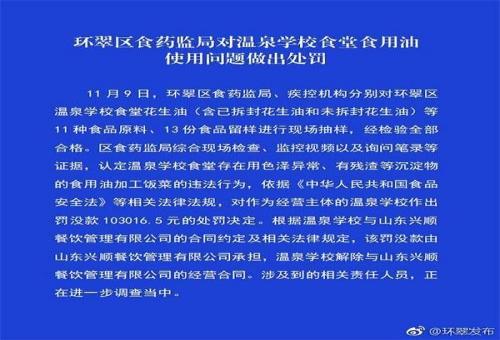 罰款十萬余元,威海環(huán)翠區(qū)食藥監(jiān)對溫泉學校食堂食用油問題做出處罰