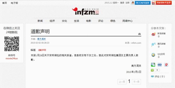 南方周末凌晨就安邦保險(xiǎn)報(bào)道發(fā)道歉聲明