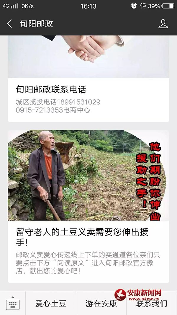 一是關注旬陽郵政微信公眾號,點擊右下角的“愛心土豆”鏈接,進入旬陽郵政官方微店直接購買;