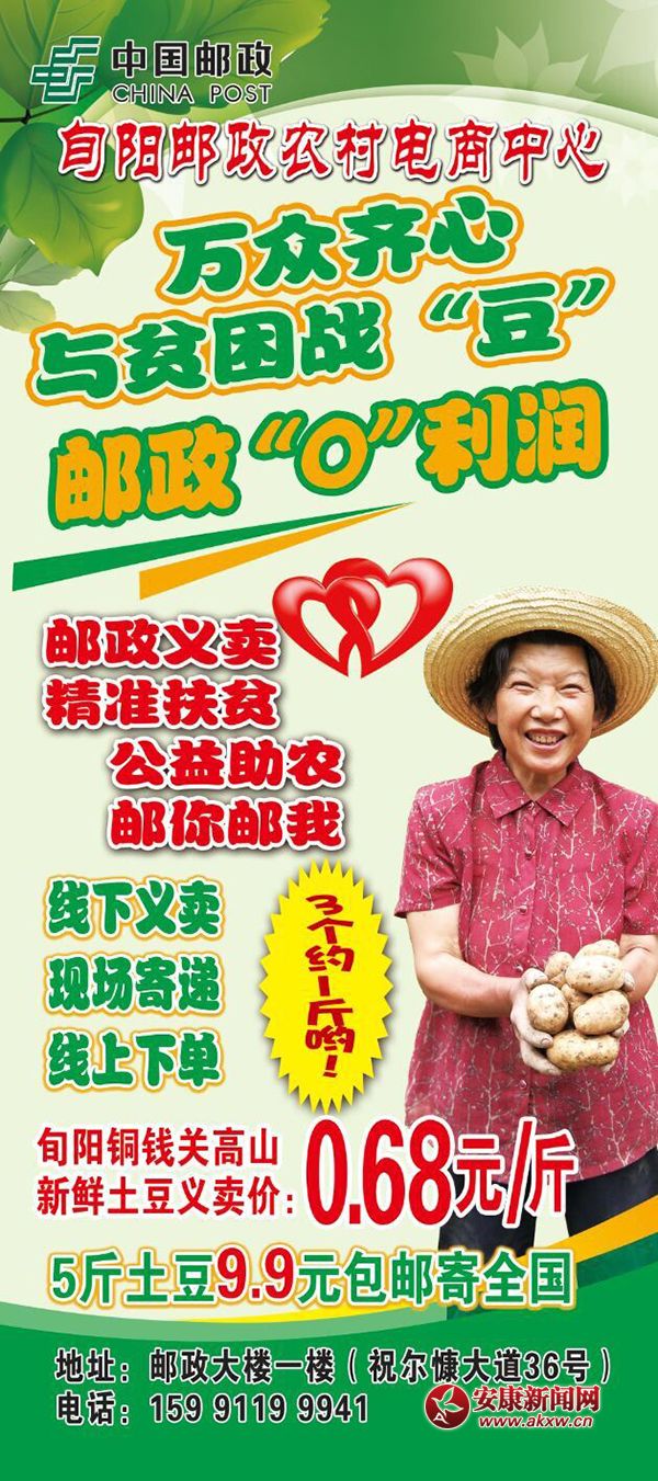 現(xiàn)在,旬陽郵政科學合理的解決供給矛盾:經過實地考察后,為解決農民銷路難題,積極響應縣委、縣政府“打贏脫貧攻堅戰(zhàn)”的號召,第一時間利用行業(yè)優(yōu)勢,通過“愛心義賣+愛心寄遞+線上訂單”活動的方式將滯銷的土豆銷出去。