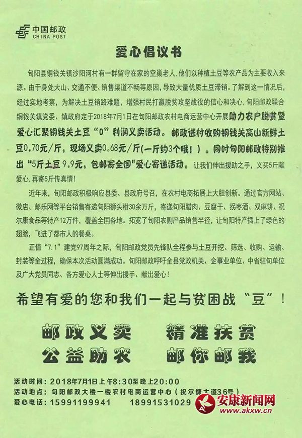 進村高價回收、線下低價義賣:旬陽郵政公司已經與銅錢關鎮(zhèn)黨委、鎮(zhèn)政府對接聯(lián)合,赴沙陽河村收購高山新鮮土豆0.70元/斤,現(xiàn)場義賣0.68元/斤。對,你沒有看錯,真正的高價收購,低價義賣,只為貧困戶的勞動有尊嚴。定于2018年7月1日8點30分至晚上8點,在旬陽郵政大樓一樓農村電商運營中心開展“助力農戶脫貧暨愛心匯聚銅錢關土豆義賣活動”。