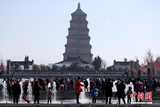 2月22日,民眾進入大雁塔北廣場的噴泉區(qū)域游玩。當日,陽光明媚,西安大雁塔北廣場迎來了大量游客,人氣十足。中新社記者 張遠 攝