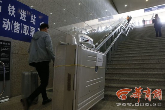 在地面一層,“親情服務崗”工作人員表示,如果出行的殘疾人是從地鐵口出來,根本不用乘升降機,只需在負一層的高鐵售票窗口買好高鐵票,然后拿著票到鐵路到達口4的地方,找工作人員,他們就會將人直接帶到列車上。記者納悶的是,讓殘疾人的設施成了擺設,而貼心服務為何又不公之于眾。 華商報記者 苗巧穎 攝影 張杰