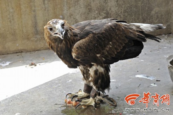 4月1日下午,在西安市興慶宮公園的鳥語林內,被西安森林公安局查扣的疑似金雕正在大口地叼著肉吃,小家伙狀態(tài)良好。這只猛禽就是華商報3月31日A03版報道的酒店大堂飼養(yǎng)的疑似國家一級保護動物金雕。