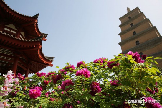 大慈恩寺里牡丹盛開(kāi),古塔下國(guó)色天香驚艷游客。aC4安康新聞網(wǎng)