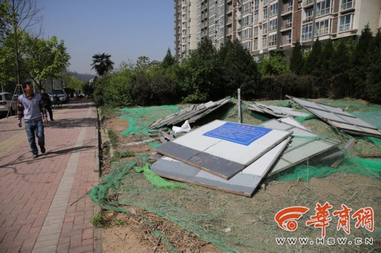 4月9日上午,華商報記者在小區(qū)正門東側(cè)綠化帶看到,有一片地已被平整出來,施劃了白線。根據(jù)圍擋上的“工程概況”,施工單位受雁塔區(qū)城管局委托,準備在這里建設(shè)“渡塵閣公廁工程”,工期為90天。