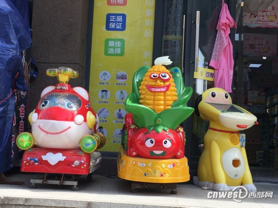 在雁塔區(qū)萬(wàn)象春天北門(mén),藥店、母嬰店、小超市門(mén)口均擺放了幾臺(tái)搖搖車(chē)。