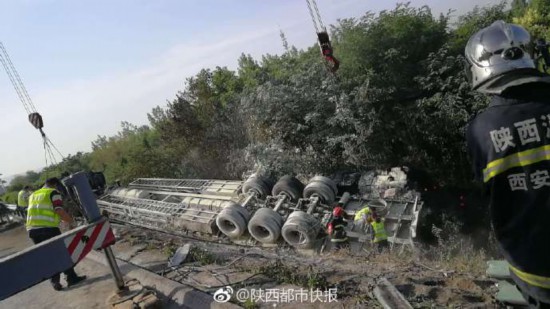 一輛裝載電石的貨車(chē)在西安繞城附近側(cè)翻。(圖據(jù)陜西都市快報(bào))3di安康新聞網(wǎng)