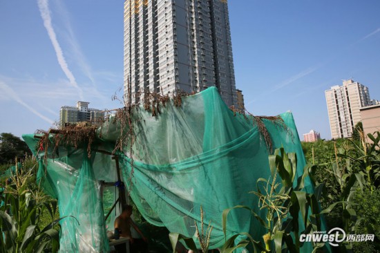 西安城墻東南角有個(gè)叫樂居場的地方,這里可是城市的中心地帶,在這高樓林立的地方有片空閑地,附近的退休老人在這里種菜。一名70多歲的老人一大早就來菜地勞動,熱了就在自己搭的窩棚里休息一會兒。NAf安康新聞網(wǎng)