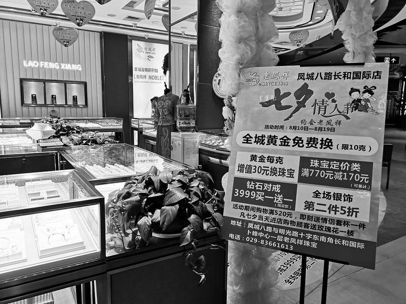 8月11日中午正逢周末,記者來到人氣極高的小寨賽格,在珠寶黃金專柜,發(fā)現(xiàn)很多珠寶品牌都趁機推出七夕活動,不少消費者正在詢價。今年27歲的趙女士說,她和男友剛剛訂婚,準備看看首飾,為婚禮準備,這段時間恰好遇到七夕節(jié)活動,如果優(yōu)惠合適的話,她們就打算購買了。