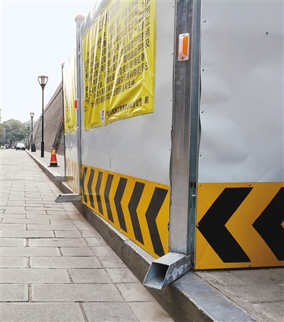 朱雀門東側(cè)順城巷內(nèi)一處圍擋基座鋼管向馬路伸出