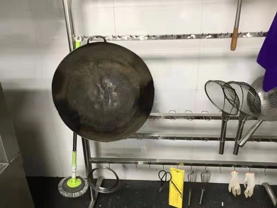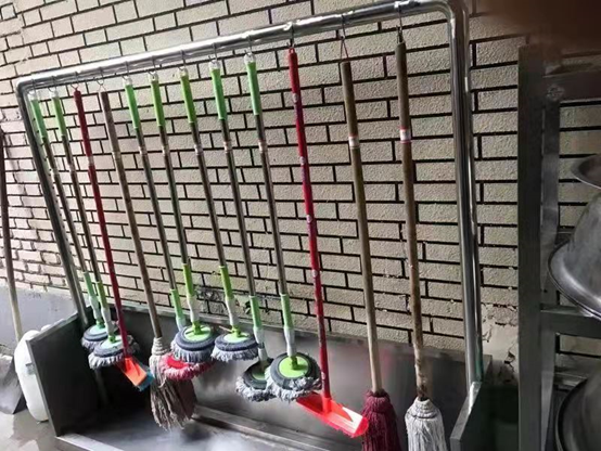 清洗煙罩專(zhuān)用拖把,有明確標(biāo)識(shí),統(tǒng)一懸掛在操作間室外東南角